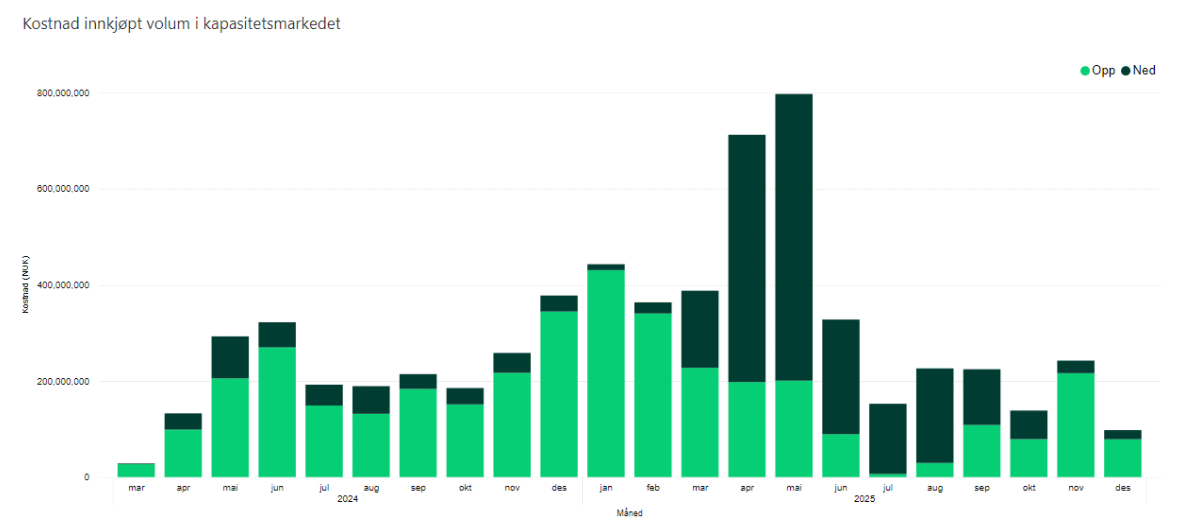 Statnetts utgifter til anskaffelse av systemtjenesten mFRR i desember var de laveste siden mars 2024. Våren i fjor gikk kostnadene i kapasitetsmarkedet i taket, og flere benyttet anledningen til å skylde på vindkraftverkene. Men vindkraftverkene stod der lenge før kostnadene gikk opp. Og de står der fortsatt, selv om kostnadene etterpå har stupt. I realiteten var kostnadene knyttet til endringer i måten tjenesten anskaffes på og måten strømnettet balanseres. I overgangsperioden kjøpte Statnett inn større reserver, noe som også økte prisene. Nå kjøpes det inn mindre volumer, i tillegg til at tilbudet har økt slik at prisene presses ned1. I fremtiden vil batterier trolig gjøre mer av denne jobben i kraftsystemet.