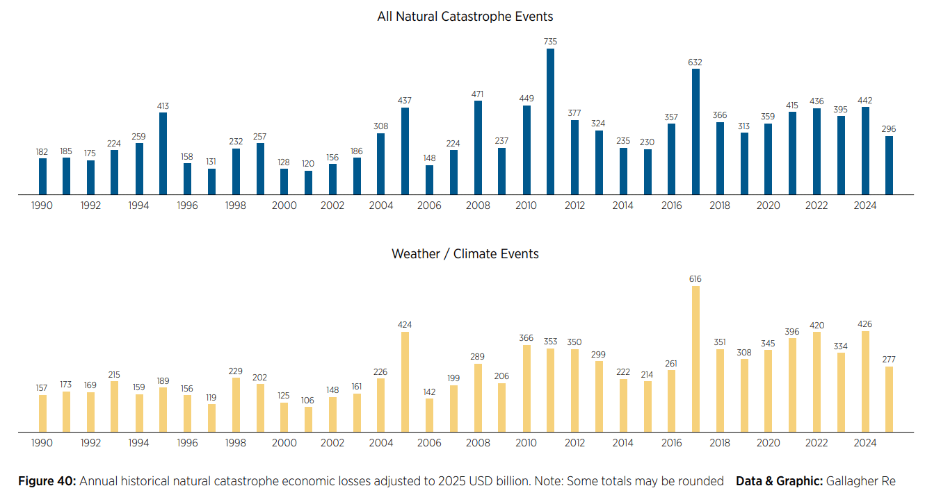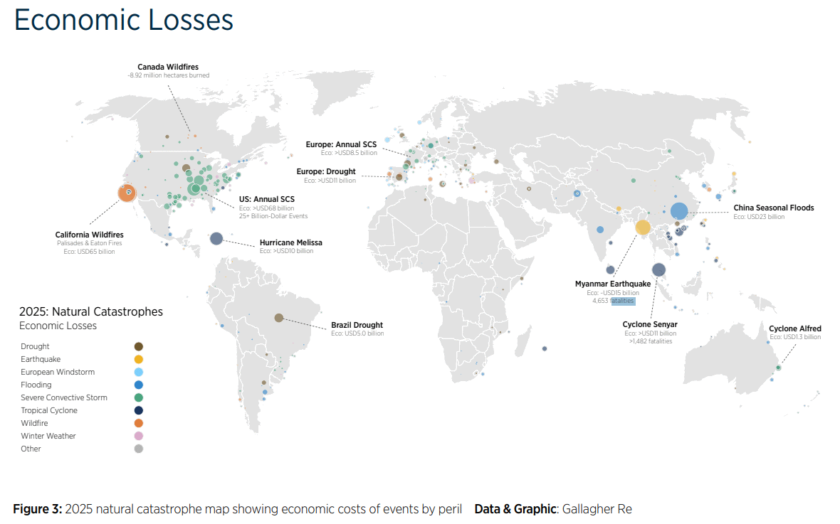 Gallagher Re, en internasjonal reassuransemegler, har publisert rapporten Natural Catastrophe and Climate Report 2025. Klima- og værrelaterte katastrofer kostet 2 784 mrd. kr.Valutakurs per 1. januar 2026. i 2025, betydelig lavere enn snittet de siste årene. Av dette var 1 256 mrd. kr.Valutakurs per 1. januar 2026. forsikret. På globalt nivå var året håndterbart fra et finansielt ståsted, men flere land opplevde alvorlige økonomiske problemer etter store katastrofer, blant disse Jamaica, Myanmar (jordskjelv), Indonesia, Sri Lanka og Pakistan. Selv om 2025 ble et "billigere" år, øker gjennomsnittet av kostnader for de siste fem årene9.