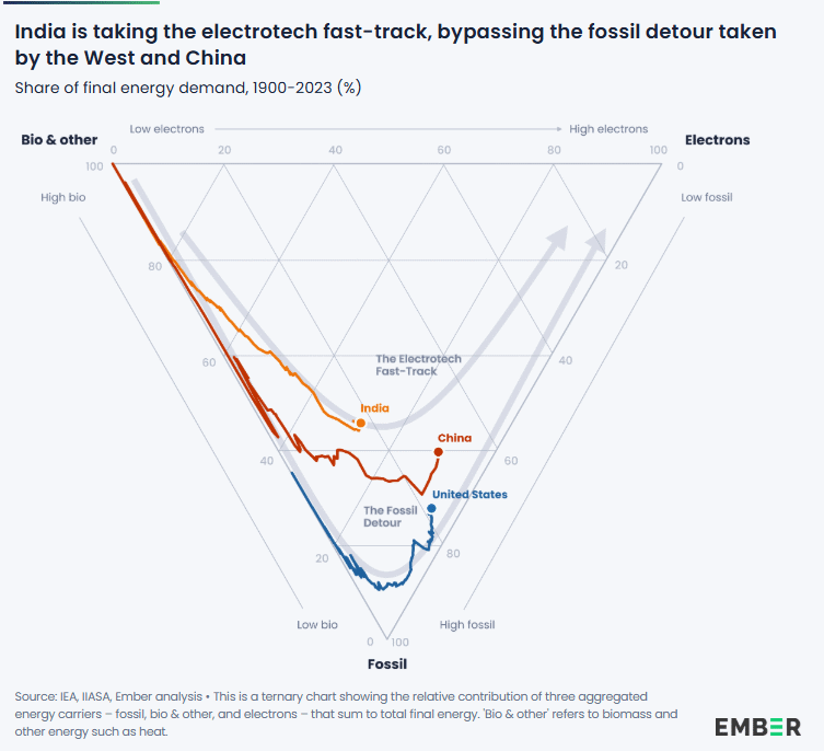 Ember skriver at fallende priser for solkraft og batterier nå gjør det mulig for India å industrialisere uten å ta omveien om fossil energi. Da Kina passerte dagens BNP per innbygger i India, var kullforbruket tre ganger høyere. Veksten i solkraft i India øker svært raskt, men elbilutbredelsen henger foreløpig etter Kina13.
