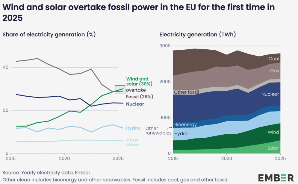 Ember har publisert rapporten European Electricity Review 2025. Før første gang produserte sol- og vindkraft mer strøm enn fossile kraftkilder i hele EU. Hjemmelaget rimelig kraft reduserer kostnadene. Et svakt år for vannkraft førte imidlertid til at regningen for gassimport økte 16 prosent og skapte pristopper i kraftmarkedet. Mindre avhengighet av import vil også redusere sårbarheten for utpressing og stryke posisjonen i internasjonale forhandlinger. 48 prosent av kraften i EU er nå fornybar etter kraftig vekst for solkraft. I tillegg til utbygging av solkraft skyldes det samme værforhold som ga mindre vann- og vindkraft, men med motsatt fortegn. En batteriboom er på gang som kan styrke energisikkerheten, redusere priser og fase ut enda mer fossil kraft12.