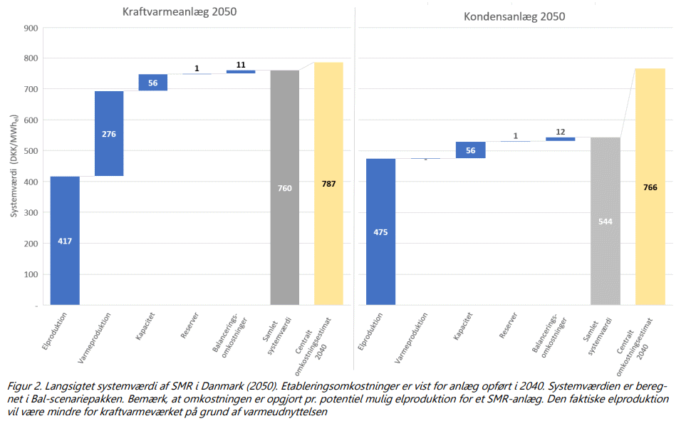 Danske Energistyrelsen har publisert rapporten Analyse af SMR-teknologiers indpasning og effekter i det danske energisystem. Som et flatt land uten vannmagasiner og langt mot nord hvor det er lite sol om vinteren, ligger det meste til rette. Rapporten konkluderer likevel med at det ikke er sannsynlig at det kan settes i drift kommersielle, serieproduserte reaktorer i Danmark før 2040. Det pekes på at robuste erfaringer fra andre land først kan ventes fra 2035. Det er behov for et betydelig forarbeide innen lokalisering, godkjennelser, regulering og planer for avfallshåndtering. I tillegg forventes en kraftig utbygging av fornybar energi å senke strømprisene i Europa etter 2040, noe som svekker lønnsomheten. Rapporten inneholder en systemkostnadsanalyse ved bruk av små modulære reaktorer i Danmark. For å oppnå positiv systemverdi trengs en investeringskostnad på rundt 63 300 kr.Valutakurs per 1. januar 2026. per kW. Dersom anlegget kan bygges som et kraftvarmeanlegg (det tas forbehold om at strømproduksjonen da vil bli mindre enn lagt til grunn), trengs 94 950 kr.Valutakurs per 1. januar 2026. per kW. Budsjettet for det pågående prosektet i Canada er på 158 250 kr.Valutakurs per 1. januar 2026. for den første og 110 775 kr.Valutakurs per 1. januar 2026. per kW for den fjerde som bygges på samme byggeplass. Kostnader til felles infrastruktur er da fordelt likt ut over de fire reaktorene.