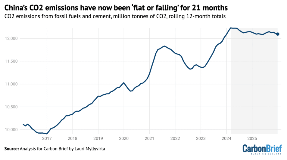 10: CB: Analysis: China’s CO2 emissions have now been ‘flat or falling’ for 21 months, besøkt 13. februar 2026
