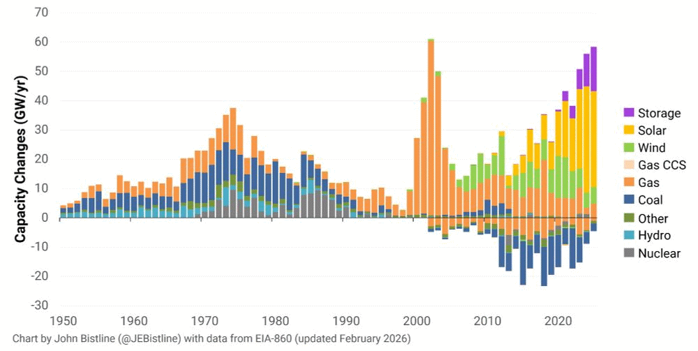 Utility Dive skriver at U.S. Energy Information Administration (EIA) mener solkraft vil levere 17 prosent mer energi i 2026. I 2027 venter ytterligere 23 prosent vekst. Vindkraft vil vokse henholdsvis 6 og 7 prosent. Økt kraftbehov vil i hovedsak bli dekket av veksten i solkraft6. EIA har også publisert oppdaterte tall for det amerikanske kraftsystemet. Analytiker John Bistline skriver på Bluesky at samlet kapasitet økte 54 GW i 2025. Av dette var 96 prosent utslippsfri7.