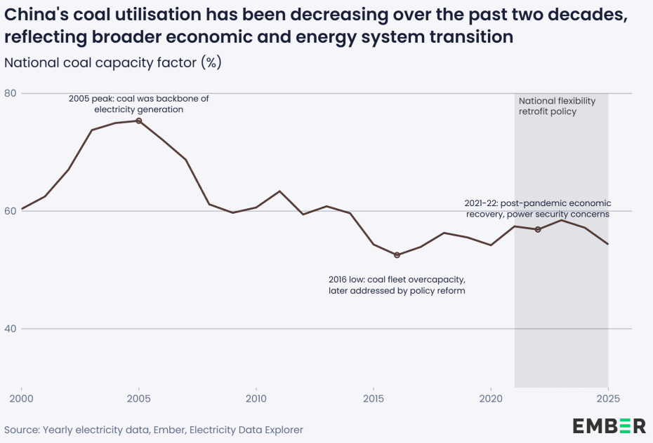 Tankesmien Ember har publisert rapporten From baseload to flexibility: How is coal’s role in China changing. Kina bygger om alle kullkraftverk fra baseload drift til å yte fleksibilitet til kraftsystemet slik at store mengder sol- og vindkraft kan fases inn. Ombyggingene er i rute til å være ferdig innen fristen i 2027. Over tid har utnyttelsen av kullkraftverkene falt11.