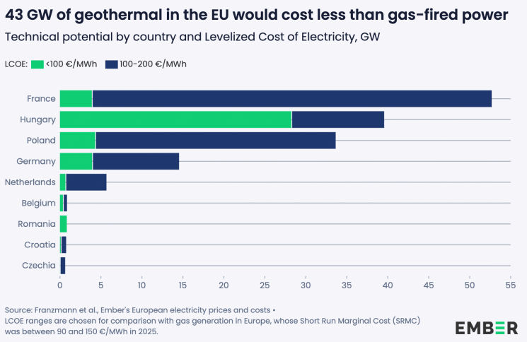 Tankesmien Ember har publisert rapporten Hot stuff: geothermal energy in Europe. Teknologien for boring av brønner og reservoarer gjør fremskritt som muliggjør avansert geotermisk elektrisitet i større deler av Europa. 43 GW kan utvikles i dag til kostnader under 1,18 kr.Valutakurs per 1. januar 2026. per kWh. Potensialet er størst i Ungarn, Polen, Tyskland og Frankrike. 42 prosent av EUs fossile kraftverk kan erstattes av geotermiske kraftverk med tilsvarende kostnad8.