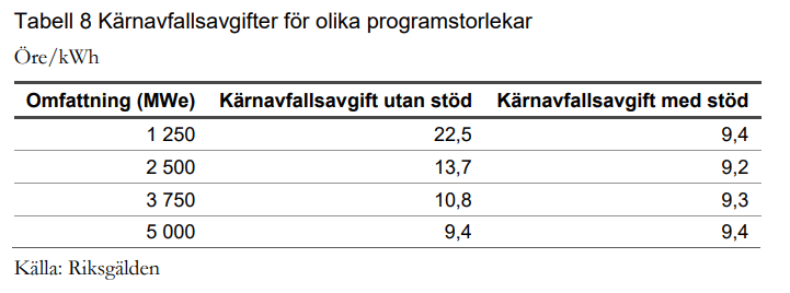Svenske Riksgälden har levert del 2 av sin utredning om finansiering av avfallshåndtering for nye reaktorer i Sverige. Deponiet som er under bygging er allerede fullt, så en helt ny løsning må finnes dersom det bygges nye reaktorer. Dersom det bare bygges noen få reaktorer, vil kostnaden for den enkelte, "programrisikoen", bli for stor. I tråd med oppdraget fra regjeringen foreslår Riksgälden at staten tar på seg programrisikoen. Dette vil være en subsidie som må godkjennes av EU-kommisjonen. Bygges 1,25 GW påtar staten seg et finansieringsansvar på 25 mrd. kr.Valutakurs per 1. juli 2025. som faller til null ved en utbygging på 5 GW. Den svenske staten vil måtte låne midlene. Samlet kostnad for skattebetalerne inkludert renter ventes å bli dobbelt så stor. Støtten vil bringe avgiften for håndtering og lagring av avfall ned fra 0,239 kr.Valutakurs per 1. juli 2025. til 0,100 kr.Valutakurs per 1. juli 2025. per kWh ved en utbygging på 1,25 GW. Riksgälden har også utredet reduserte avgifter, også dette ved at staten påtar seg en større risiko. Avgiften kan senkes til rundt 0,056 kr.Valutakurs per 1. juli 2025. per kWh ved at statens restrisiko økes fra 76 mrd. kr.Valutakurs per 1. juli 2025. med dagens regelverk til 169 mrd. kr.Valutakurs per 1. juli 2025.35. Den svenske regjeringen har også igangsatt et arbeid for å etablere erstatningsordninger dersom nye politiske flertall i fremtiden skulle ønske å stanse eller avvikle nye kjernekraftverk36. Disse støtteordningene kommer i tillegg til varslede subsidierte statslån, 40 års differansekontrakt, samt garantier for overskudd til utbygger også i tilfelle overskridelser eller andre problemer.