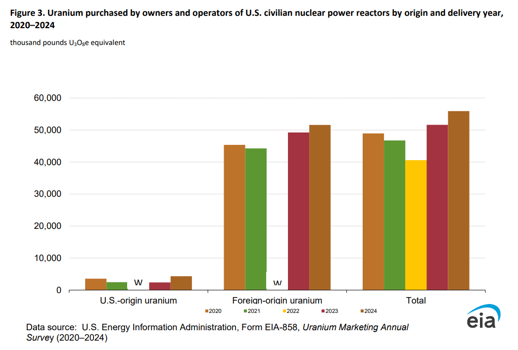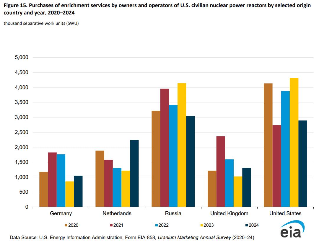 U.S. Energy Information Administration (EIA) har publisert rapporten 2024 Uranium Marketing Annual Report. Kostnadene for brensel til amerikanske reaktorer er stigende. Kontrakter har ofte 5-15 års varighet. Økte markedspriser for uran, som er ventet å vare ved, vil derfor gradvis slå inn i driftskostnadene. Volumvektet gjennomsnittspris i 2024 var på 528,64 kr.Valutakurs per 1. juli 2025. per lb/U3O8, en økning på 20 prosent fra året før. Prisen på nye kontrakter var på 864,52 kr.Valutakurs per 1. juli 2025. per lb/U3O8. Analytikere har uttalt at økte priser både for råvaren og bearbeidingen utgjør 0,10 kr.Valutakurs per 1. juli 2025. per kWh i nye kontrakter. EIA-rapporten viser også at USA importerte 92 prosent av uranet til sine kraftverk. Største eksportør var Canada, men 24 prosent kom fra Kasakhstan, 9 prosent fra Usbekistan og 4 prosent fra Russland. Russland stod for 20 prosent av anrikingen av uran til amerikanske kjernekraftverk43. Billig russisk anriking medførte nedleggelser av amerikanske anlegg etter murens fall. Nå bygges det nye anrikingsanlegg igjen, med betydelig statlig støtte, men det tar lang tid og USA er fortsatt helt avhengig av Russland. Situasjonen har mange likhetstrekk med den tyske bruken av billig russisk gass.