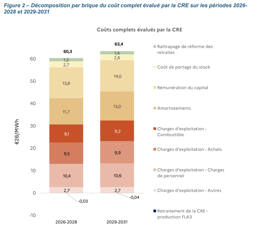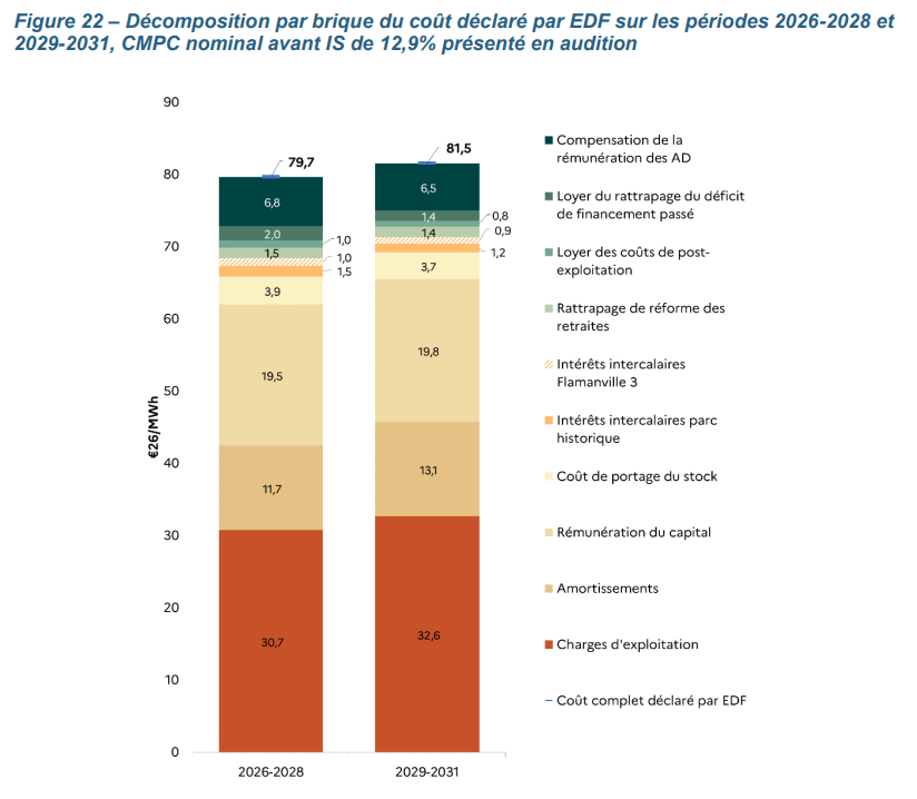 Franske Commission de régulation de l’énergie (CRE) har publisert rapporten Évaluation des coûts complets de production de l’électricité au moyen des centrales électronucléaires historiques pour la période 2026-2028. Formålet er beregne den faktiske produksjonskostaden for den historiske parken av 56 franske kjernekraftverk samt nye Flamanville 3. Det er etablert en progressiv skatt som skal utskrives dersom inntektene overskrider produksjonskostnaden med definerte nivåer. Skatten introduseres samtidig som all kraft skal omsettes fritt i markedet fra årsskiftet, etter at deler tidligere ble solgt til industrien til regulert pris. Fallende markedspriser i Europa gjør at det for neste år er labre utsikter til skatteinntekter for en slunken fransk statskasse. Og det er på tross av at CRE mener kostnadene er betydelig lavere enn produsenten selv. EDF anfører totale produksjonskostnader på 0,94 kr.Valutakurs per 1. juli 2025. per kWh i perioden 2026-28 og 0,97 kr.Valutakurs per 1. juli 2025. i 2029-31. Dette avvises av CRE, som konkluderer med 0,71 kr.Valutakurs per 1. juli 2025. per kWh i perioden 2026-28 og 0,75 kr.Valutakurs per 1. juli 2025. i 2029-31. Den betydelige forskjellen skyldes blant annet at EDF har inkludert betjening av gjeld fra tidligere underskudd, at CRE har satt ned kapitalkostnaden og nye retningslinjer for beregningene som gjør at kostnader til fremtidig dekommisjonering er kuttet. Økningen mellom de to periodene forklares med økte kostnader til håndtering av brukt brensel og kostnader til levetidsforlengelser44.