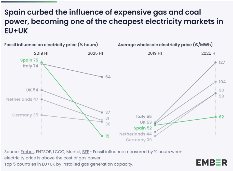 Ember har publisert rapporten Decoupled: how Spain cut the link between gas and power prices using renewables. Flere europeiske land har høye strømpriser fordi dyr gasskraft setter strømprisen når det ikke produseres nok fornybar energi. Spania har, takket være en rask utbygging av sol- og vindkraft, lykkes med å skyve ut gass større deler av tiden. På den måten har Spania oppnådd lavere strømpriser enn de fleste land i Europa. Spania henger imidlertid etter på utbygging av batterier og åpning for bruk av fornybar energi til systemtjenester9.