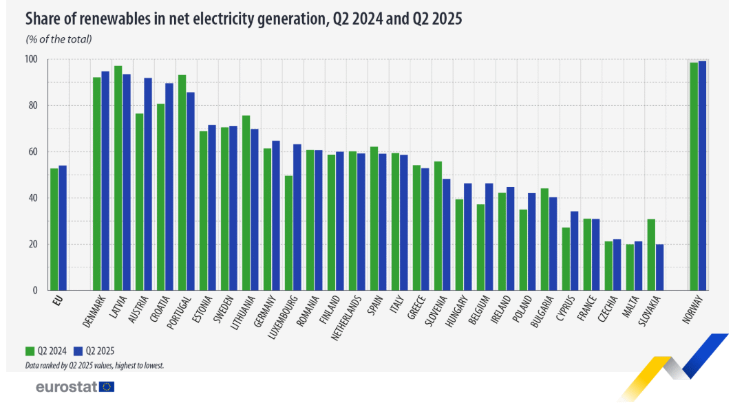 For første gang ble solkraft den største kraftkilden i EU. Det skjedde i juni måned, i følge Eurostat, hvor solkraft leverte 22 prosent av elektrisiteten. Fornybar energi levert 54 prosent av strømmen i andre kvartal, opp fra 52,7 prosent samme periode i fjor8.