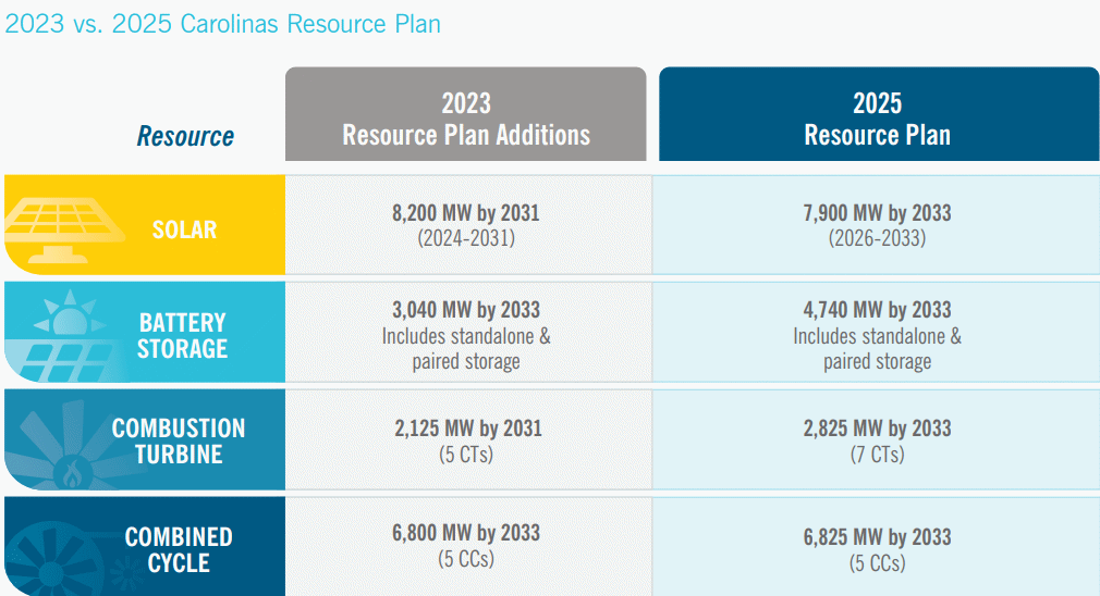 Duke Energy leverer en oppdatert Integrated Resource Plan (IRP) som en av de første etter kursendringen i Washington. I tillegg har delstatspolitikerne i North Carolina løsnet på klimamålet i 2035 (men holdt fast på netto null i 2050). Siden planen i 2023 har også forbruksprognosen økt kraftig. I den nye planen gis tre kullkraftverk to til fire års utsatt nedleggelse sammenlignet med planen fra 2023. Nye gasskraftverk for topplast øker fra 2,1 til 2,8 GW. Ny solkraft reduseres fra 8,2 til 7,9 GW. 3,6 GW ny vindkraft skyves til etter 2040, men dette skal vurderes på nytt i neste planoppdatering. Utredning av 600 MW SMR i 2035 er endret til 1,1 GW kjernekraft i 2037, det vil si at det nå vurderes et konvensjonelt kjernekraftverk som alternativ. Batterilagring er økt fra 3 GW til 4,7 GW22.