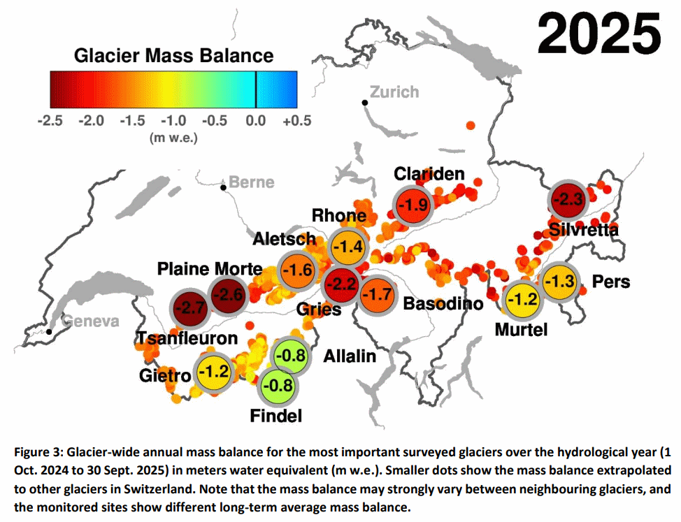 Glacier Monitoring Switzerland (GLAMOS) har publisert rapporten Annual mass balance of Swiss glaciers in 2024/2025. Isbreene forsvinner nå i et svært raskt tempo. Siste år forsvant tre prosent av massen, og siste ti år har 25 prosent blitt borte. Smeltende isbreer truer vannforsyning og kraftproduksjon, og kan utløse jordskred og flommer. I tillegg bidrar smeltingen til havnivåstigning1.