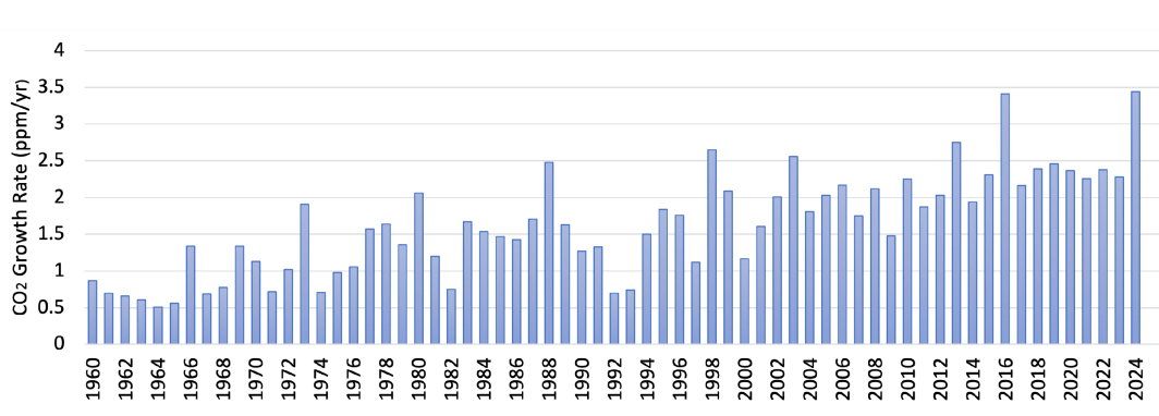 Verdens meteorologiske organisasjon skriver at det ble målt rekordnivåer av alle de tre viktigste klimagassene i atmosfæren. Sammenlignet med førindustriell tid utgjør nivåene nå 152 prosent for CO2, 266 prosent for CH4 og 125 prosent for N2. Veksten av CO2 i atmosfæren har de siste årene vist en svakt fallende trend. I 2024 kom imidlertid et stort byks, på linje med 2016. Utslippene var om lag på samme nivå som året før, og kan forklare en vekst på 2,4 ppm. Den ytterligere økningen på 1,1 ppm skyldes i følge WMO mest sannsynlig branner samt redusert karbonopptak i hav og skog15.