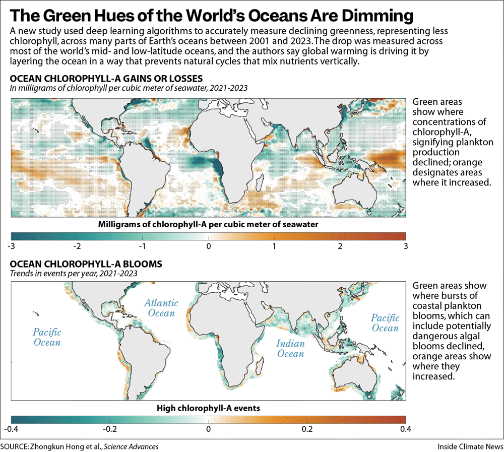 Inside Climate News omtaler en ny studie basert på satelittbilder som viser at havets grønnfarge avtar. Endringene er tegn på at det blir mindre planteplankton, noe som kan true økosystemene som mye av livet i havet er basert på. Planktonet produserer også oksygen og fanger CO2 som faller ned og lagres på havbunnen. Endringene beskrives som et klart tegn på at menneskeskapte klimaendringer svekker karbonkretsløpet18.
