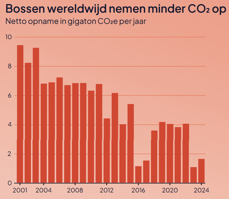 Nederlands vitenskapelige klimaråd (WKR) har publisert rapporten Bossen en bodems in zwaar weer. Karbonopptaket i skog og jordsmonn faller raskere enn ventet. Skogen og jordsmonnet viser seg å være mer sårbare for akkumuleringen av ekstrem varme, tørke og branner enn man trodde før. Konsekvensen er at karbonbudsjettet blir mindre og det blir vanskeligere å nå temperaturmålene. De negative konsekvensene og kostnadene knyttet til utslippene blir også enda større17.