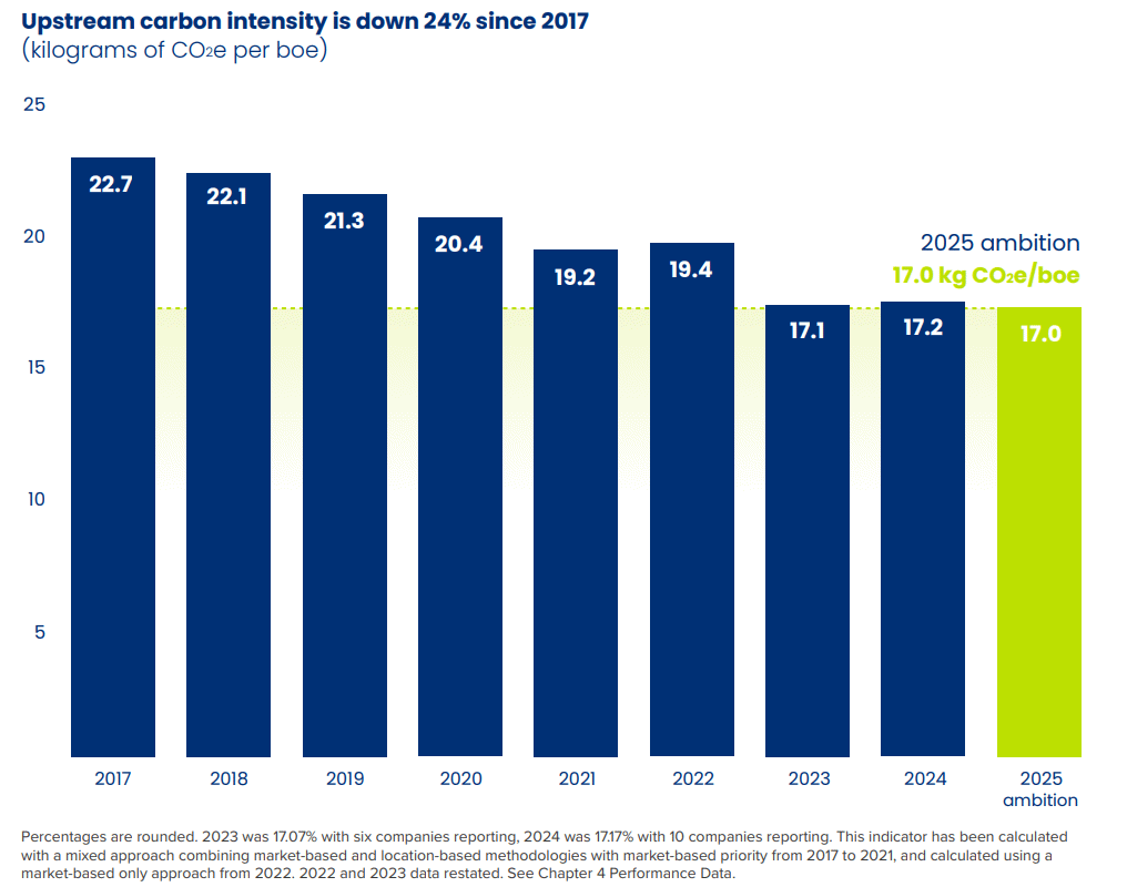 Oil and Gas Climate Initiative (OGCI) har publisert rapporten Staying the Course - Progress Report 2025. Selskapene har kuttet oppstrøms utslippsintensitet med 24 prosent siden 2017, marginalt mindre enn målsetningen. Metanutslippene er kuttet med 60 prosent, betydelig mer enn målet. Rutinemessig fakling er rdusert med 72 prosent siden 2018. Selskapene er involvert i mer enn 50 prosjekter med karbonfangst og -lagring4.