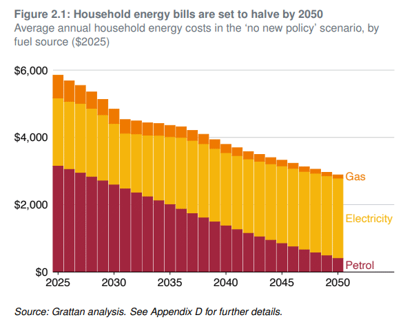 Grattan Institute har publisert rapporten Bills down, emissions down. Husholdningenes energikostnader vil bli nesten halvert til 2050. Det gir rom for en skjerping av klimapolitikken, mener Grattan. En skatt på karbon, et kontroversielt tema i Australia, vil gi en liten økningen i kostnadene i 2050, men fortsatt store besparelser sammenlignet med i dag6.