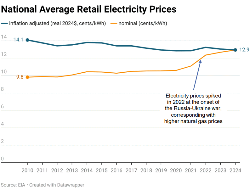 Lawrence Berkeley National Laboratory (LBL) har gransket økningen i amerikanske strømpriser (alle kostnader inkludert). Årsaker til økninger varierer fra stat til stat og mye av økningen følger inflasjonen. Prisene gjorde et hopp på grunn av Russlands fullskala invasjon av Ukraina (helt uten kabler!). Blant konklusjonene er at høy andel gass gir eksponering mot økte gasspriser. Markedsbasert utbygging av sol- og vindkraft senker strømprisene, mens solkraft bak måleren og pålagte utbygginger trekker i motsatt retning (unntatt for de med solkraftanlegget). Økt kraftforbruk har senket prisene fordi faste kostnader kan fordeles på flere, men det er usikkert om det vil fortsette. Behovet for å fornye aldrende strømnett har økt prisen i mange delstater. Den store økningen i California skyldes primært skogbranner, noe som også rammer andre stater7.