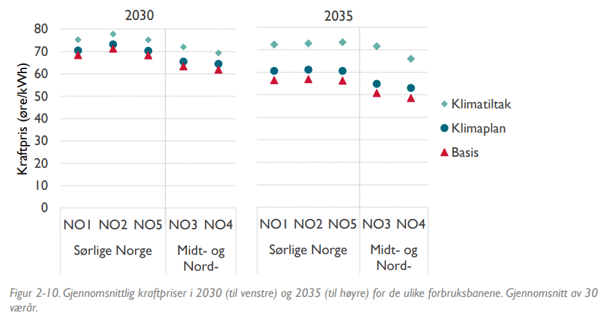 NVE har publisert rapporten Scenarioer for kraftmarkedet 2025. Rapporten vurderer effekter på kraftmarkedet av forslagene til nye klimatiltak i statsbudsjettet for 2026 (scenario "Klimaplan"). I tillegg vurderes et scenario hvor samtlige klimatiltak utredet av Miljødirektoratet gjennomføres ("Klimatiltak") og et nordisk scenario. Tiltakene i budsjettet kan gi et økt kraftforbruk på 3 TWh i 2030 og 4 TWh i 2035 utover gjeldene prognoser. Det tilsvarer om lag halvparten av ventet produksjon fra Sørlige Nordsjø II. Gitt ingen ytterligere økt produksjon, vil kraftbalansen svekkes og kraftprisene - alt annet likt - øke. NVE anslår økningen til 2-3 øre per kWh i 2030 og 4-5 øre per kWh i 2035. Tallene er gjennomsnitt i normalår. I årets statsbudsjett ble også elavgiften foreslått satt ned med 5,6 øre per kWh i vinterhalvåret og 12,75 øre per kWh i sommerhalvåret sammenlignet med 20259.