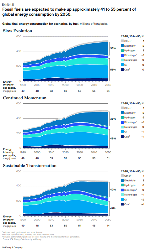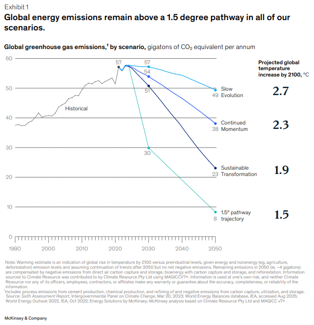 McKinsey har publisert Global Energy Perspectives 2025. Det er et gap mellom den pågående utviklingen og muligheten til å unngå de verste konsekvensene menneskeskapte klimaendringer. På tvers av scenarioene ventes fossil energibruk å utgjøre mellom 41 og 55 prosent i 205014.