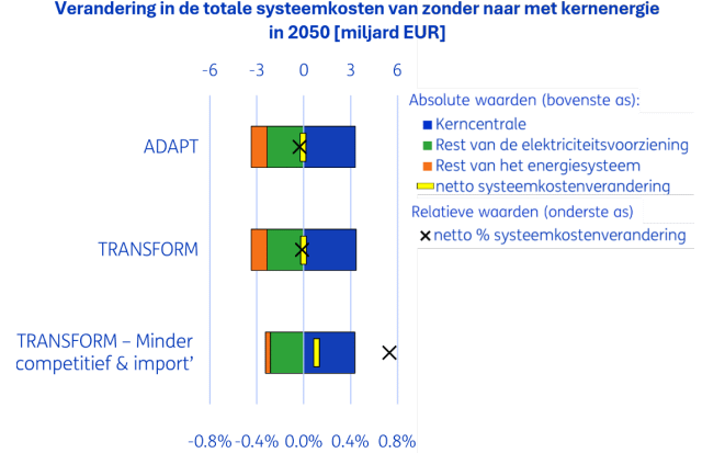 Det er gjennomført en systemkostnadsstudie (for Nederland) hvor 2-4 kjernekraftverk på inntil 6 GW sammenlignes med en tilsvarende ekstra utbygging av havvind med tilhørende fleksibilitet. I begge alternativer vil det være en stor utbygging av solkraft, havvind og vindkraft på land. Ved høy vekst i etterspørselen etter kraft, er kostnadene for de to alternativene like når alle kostnader inkluderes. Her er kraftmarkedet stramt og kostbare effektiviseringstiltak påvirker systemkostnaden. Ved lavere vekst i etterspørselen etter kraft, er et kraftsystem med kjernekraft 9,5 mrd. kr.Valutakurs per 1. juli 2025. dyrere per år i 2050. Det utgjør 0,7 prosent av samlede kostnader48.