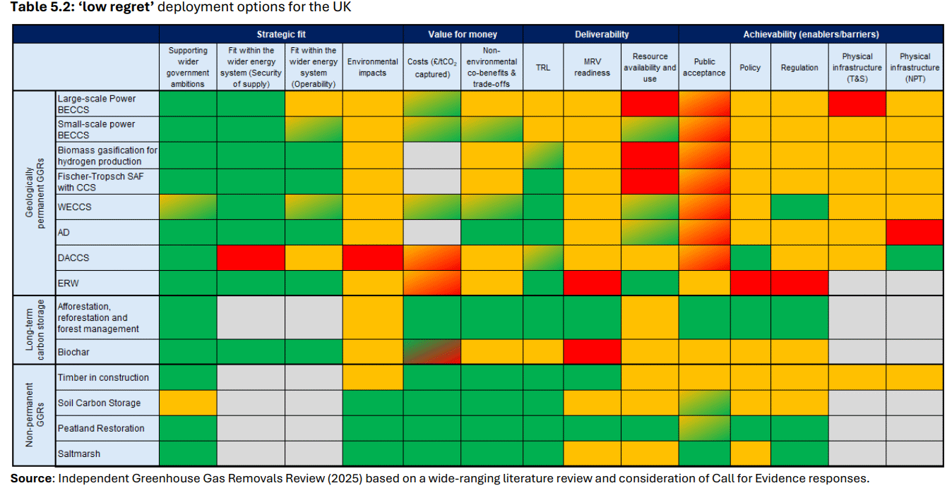 Den britiske regjeringen har publisert rapporten Independent Review of Greenhouse Gas Removals. Karbonnegative løsninger vil være nødvendige for å kompensere for utslipp som det er umulig eller ikke regningssvarende å fjerne. Og hvis det slippes ut langt mer enn klimabudsjettene tilsier, vil det bli et enda større behov med sikte på å gjenopprette et levelig klima på jorden. Det finnes en rekke ulike metoder og teknologier, men mange er i tidlig fase og har høye kostnader. Rapporten anbefaler at det utarbeides en britisk strategi for karbonnegative løsninger og fremmer en rekke forslag til innholdet19.