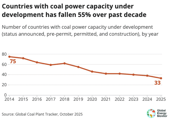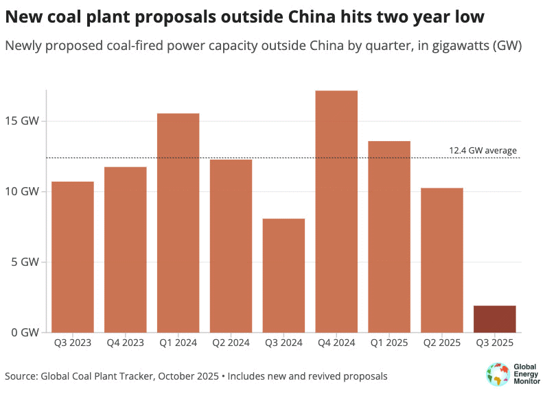 Antallet land som har nye kullkraftverk i prosess har falt fra 75 i 2014 til 33 i dag. Siste kvartal ble det, utenfor Kina, bare foreslått 2 GW ny kullkraft. Det skriver Global Energy Monitor på Bluesky9. Foreslåtte kraftverk blir ikke nødvendigvis verken omsøkt eller bygget. I tredje kvartal kansellerte Indonesia, Mongolia og Thailand 6 GW foreslåtte kullkraft. I Kina fortsetter trenden hvor det bygges nye kullkraftverk, samtidig som de brukes mindre10. Samlet sett har kraft generert fra kullkraft i Kina vært svakt fallende siden våren 2024, og en del analytikere mener utslippene fra kullkraft i Kina har nådd en platåfase.