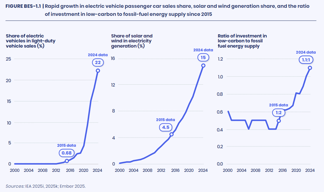 Systems Change Lab har publisert rapporten State of Climate Action 2025. Verden har sett bemerkelsesverdige fremskritt, særlig innen elbiler og fornybar energi, siden Paris-avtalen ble inngått i 2015. På andre områder går det saktere, og på enkelte feil vei. Selv om utslippene er høyere i dag, er utslippsbanen mye lavere. Før Paris-avtalen var verden på vei mot katastrofale 4 grader oppvarming. Vedtatt politikk styrer mot 2,7 - 3,1 grader. Hvis annonserte klimamål følges bærer det mot 2,1 - 2,8 grader1. Det er fortsatt nivåer som vil føre til store skader på naturmangfold, gjøre områder ubeboelige og tvinge mennesker på flukt, samt påføre vanlige folk store kostnader langt utover kostnaden for klimatiltakene.