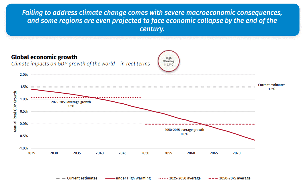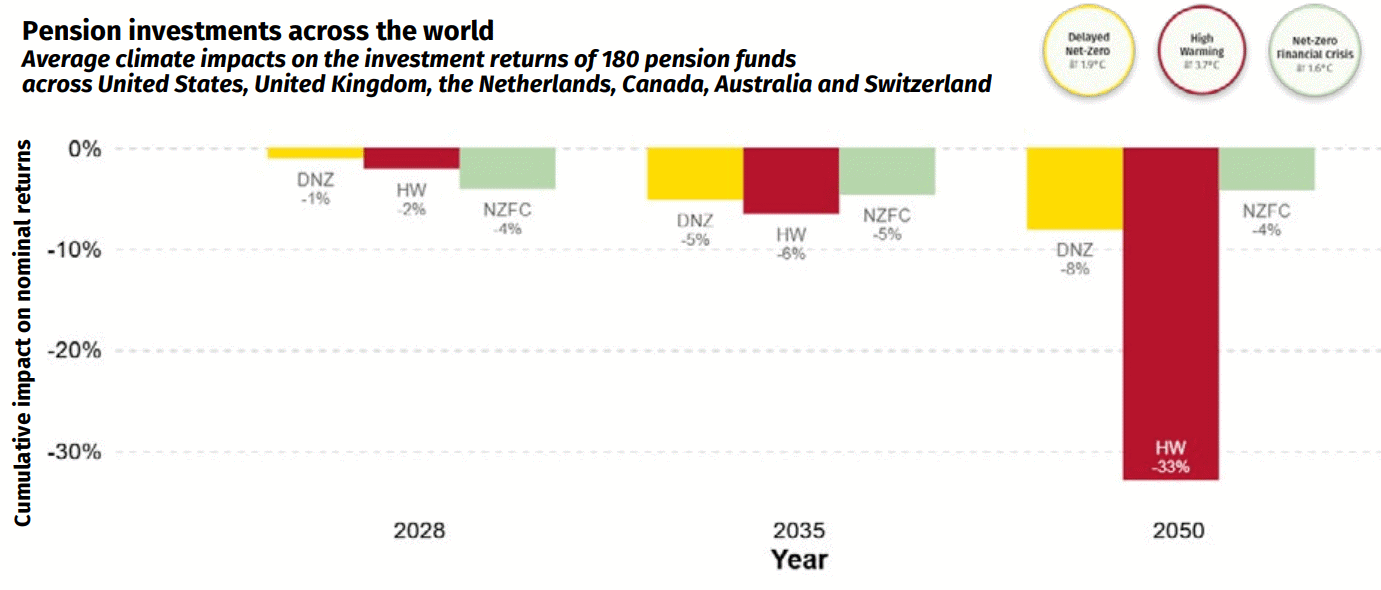 Investeringsrådgiver Ortec Finance har publisert rapporten Translating the cost of climate change for the global pension industry: 2025 update. Høy global oppvarming kan radere bort 33 prosent av avkastningen til pensjonsfond globalt innen 2050, før det tas hensyn til inflasjon. Høy global oppvarming er her 3,7 grader. Verdens BNP i 2050 kan i et slik scenario skyves ti prosent under gjeldende anslag. Mellom 2050 og 2075 kan BNP-vektsten stanse helt. En ordnet klimaomstilling ("Delayed Net Zero") gir minst fall i avkastningen på kort sikt. Scenarioet "Net Zero Financial Crisis", hvor økonomien brått skiftes bort fra forurensende løsninger, gir noe lavere avkastning på kort sikt, men klart høyest på lang sikt. Allerede i 2035 vil avkastning i et slikt scenario være høyere enn "High Warming"-scenarioet3.