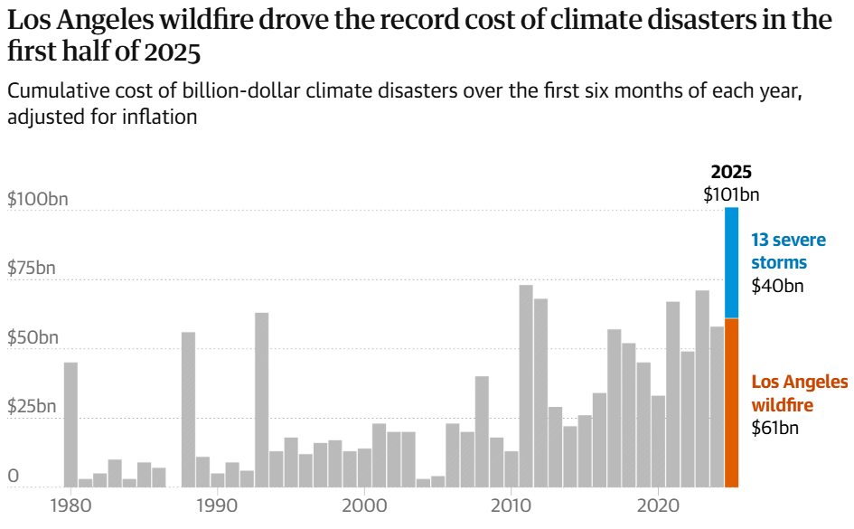 The Guardian skriver at kostnader for klimakatastroer i USA var rekordhøye første halvår i år. Summen for de største katastrofene kom opp i 1 013 mrd. kr.Valutakurs per 1. juli 2025. Amerikanske myndigheter har lenge ført statistikken, men arbeidet ble nedlagt etter presidentskiftet. Nå videreføres arbeidet i privat regi. Det var særlig brannene i Los Angeles som bidro til rekorden7. USA har så langt sluppet billig fra høststormene i år, så det er håp om at året samlet sett blir noe bedre.