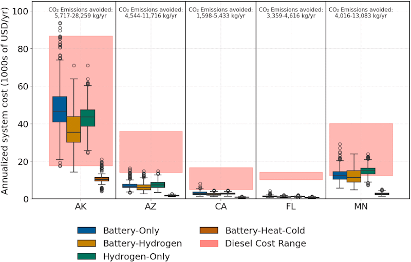 En studie publisert i Smart Energy sammenligner solkraft og ulike energilagringsløsninger med dieselgeneratorer i microgrids (små, isolerte strømnett). Besparelsene ved å kutte ut diesel er over eller lik 67 prosent i 75 prosent av de analyserte systemene. Analysene er gjennomført for ulike delstater i USA, hvor Alaska er den nordligste. Studien viser at kombinasjon av batteri og hydrogen i mange tilfeller er billigst. Unntaket er Alaska, hvor et varmelager også må til for å være garantert å komme under dieselkostnad28. Solceller i Alaska? New York Times skriver denne uken om et forsøksprosjekt i kombinasjon med landbruk (agrivoltaics)29.