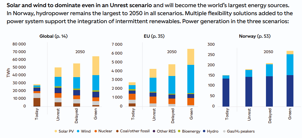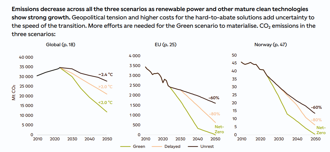 Statkraft har publisert rapporten Green Transition Scenarios 2025. Det er grunner til å være optimistisk når man ser på utviklingen innen solkraft, vindkraft og batterier. Europa kutter sine utslipp, mens Kina kan være ved utslippstoppen. Men mer må gjøres. De viktigste trendene fremover innebærer at sol- ogvindkraft blir verdens største energikilder innen 2035. Batterier leverer mye nødvendig fleksibilitet. Forbruket av elektrisitet vil øke kraftig, mens samlet energiforbruk går ned (på grunn av økt effektivitet). Gass forblir lenger i energimiksen, mens CCS og hydrogen skalerer saktere. I rapporten beskrives tre scenarioer for utviklingen, "Unrest", "Delayed" og "Green"18.