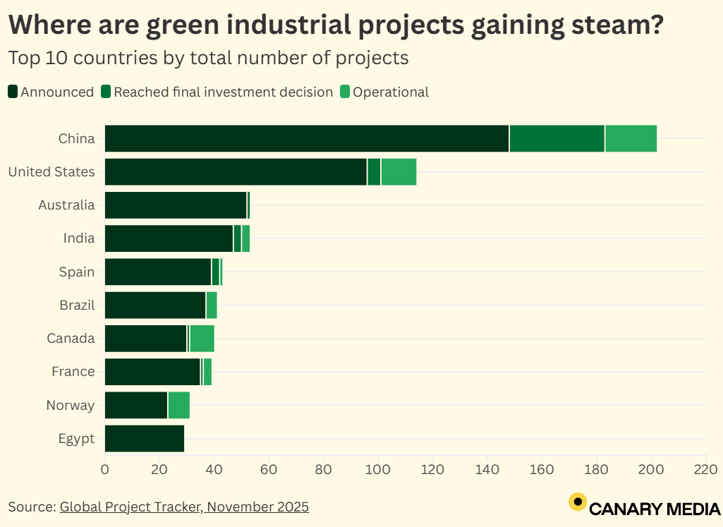 Mer enn tusen grønne industriprosjekter er registrert i en global database. Mange er i tidlig fase og en del av disse vil ikke lykkes, i likhet med vanlige industriprosjekter. Åtte prosent av prosjektene er i drift, seks prosent har tatt endelig investeringsbeslutning og ytterligere syv prosent vil trolig gjøre det snarlig. Aller flest prosjekter er det i Kina, med over to hundre. USA ligger ikke langt bak, med over hundre. Det skriver Canary Media. Også Norge har fått en plass på listen43.