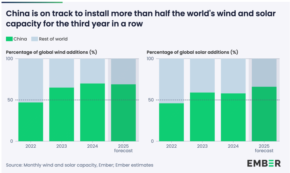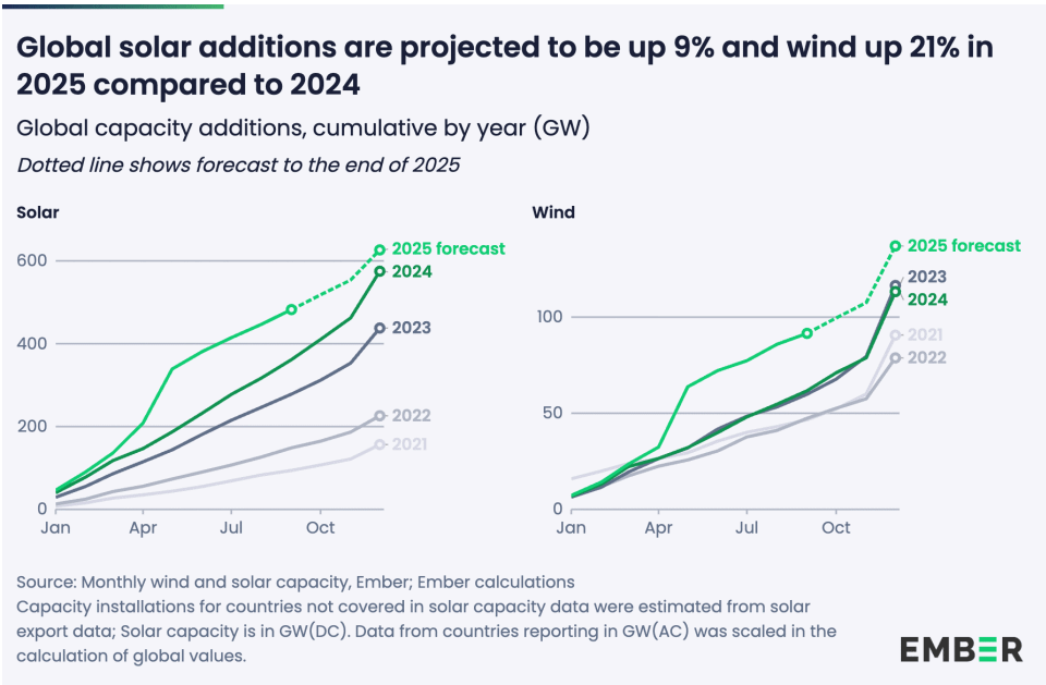 Ember skriver at nye prognoser for 2025 viser nok et år med økt utbygging av sol- og vindkraft i verden. Målet om å tredoble kapasiteten innen 2030 er innen rekkevidde. Det bygges klart mest solkraft, mens vind ligger an til å øke mest i 2025. For tredje år på rad er mer enn halvparten av utbyggingen i Kina18.