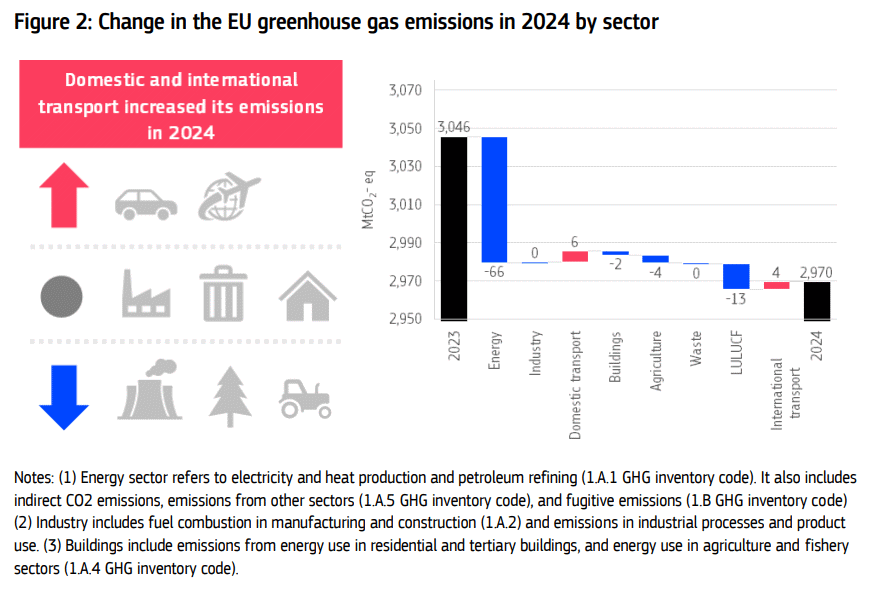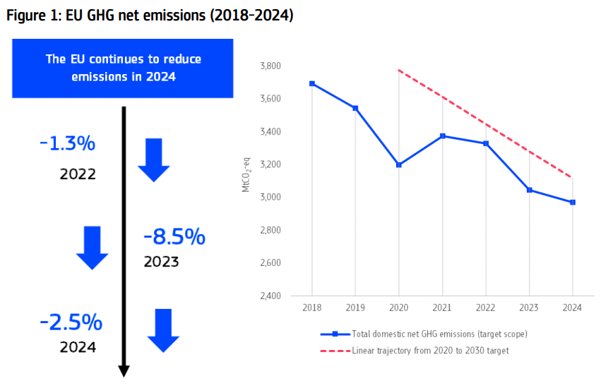 EU-kommisjonen har publisert rapporten Climate Action Progress Report 2025. EU kuttet utslippene av klimagasser med 2,5 prosent i 2024, og er i rute til å nå målet om 55 prosent kutt i 2030 med dagens og planlagte klimatiltak. Det er særlig energisektoren som stod for de største kuttene i 2024, med små økninger fra transport. Siden 1990 er utslippene kuttet med 37 prosent samtidig som økonomien har vokst med 71 prosent12.