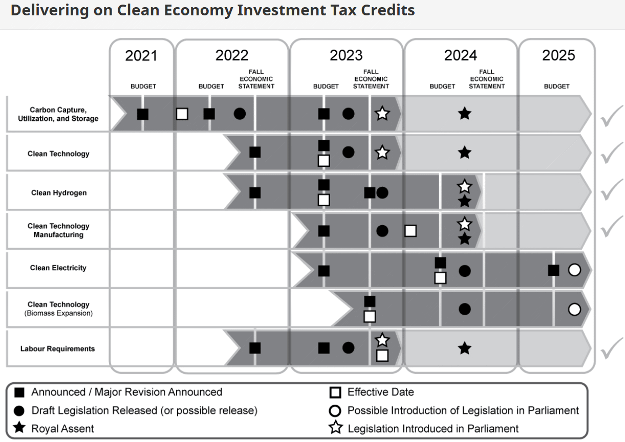Regjeringen i Canada har lagt frem sin Climate Competitveness Strategy i årets budsjettforslag. Klimatiltak er ikke bare en moralsk forpliktelse, men også en økonomisk nødvendighet. Canadian Climate Institute har beregnet at husholdningenes inntekter kan reduseres med 20 prosent dersom klimaendringene ikke begrenses. Globalt etterspørres det i større grad varer med lave produksjonsutslippp. I budsjettet varsles det at karbonprisingen for industri skal forbedres og settes på en bane til netto null utslipp i 2050. Reguleringen av metanutslipp skal skjerpes og utslipp fra olje- og gassutvinning kuttes. Flere skattekreditter for grønne investeringer er på gang16.