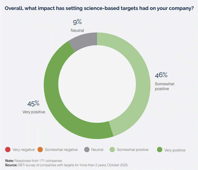 Science Based Targets har publisert rapporten The Impact of Setting Science Based Targets on Businesses. Organisasjonen jobber nå med 11 000 bedrifter som representerer 40 prosent av global markedsverdi. De siste 18 månedene er antallet med kortsiktige klimamål doblet, mens antallet med netto null-mål er tredoblet. Bedriftene har positive erfaringer med å sette seg klimamål. Det store flertallet følger opp målene17.