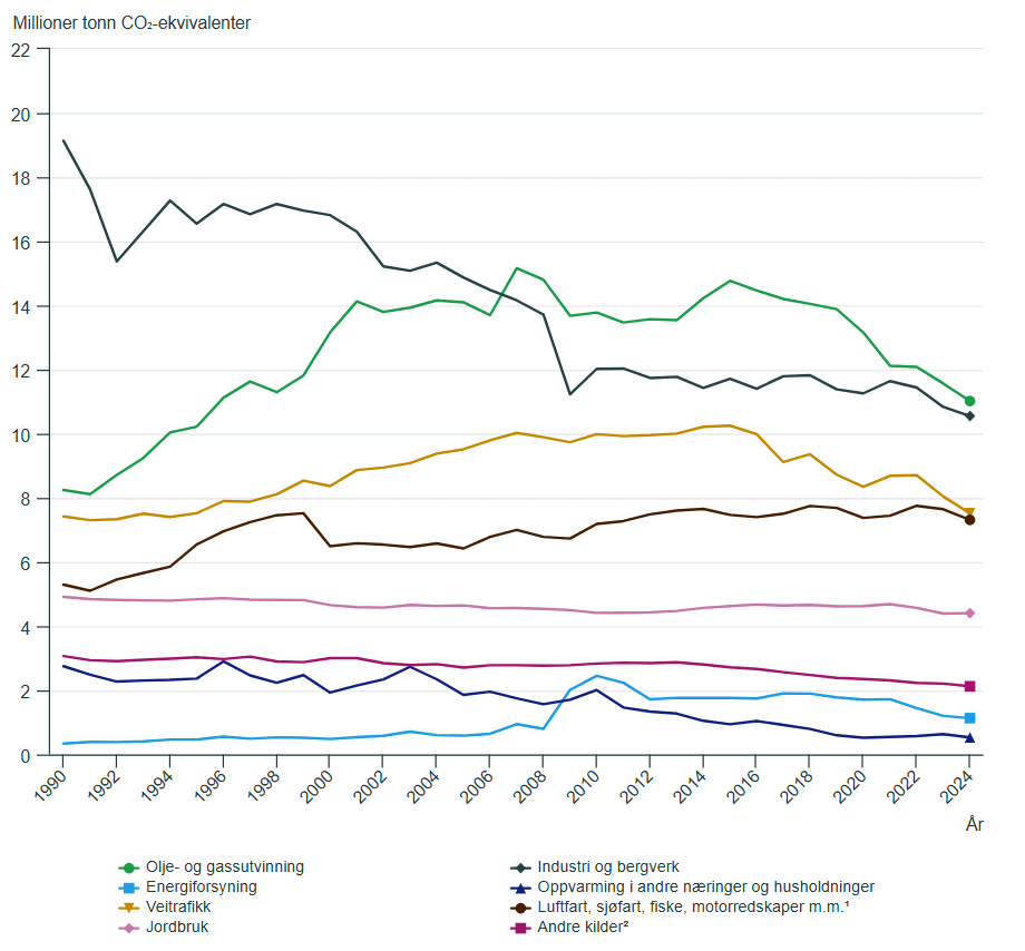 Norske klimagassutslipp falt fire prosent fra 2023 til 2024. Det viser tall fra SSB. Det er 13 prosent ned fra 1990 og ned 18 prosent fra toppen i 2015. Nedgangen siste år skyldes i hovedsak elektrifisering av sokkelen, driftsstans på industrianlegg, mer biodrivstoff og flere elbiler14.