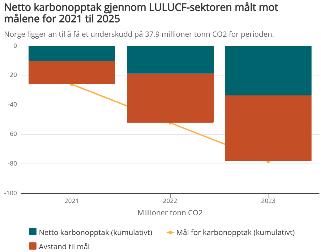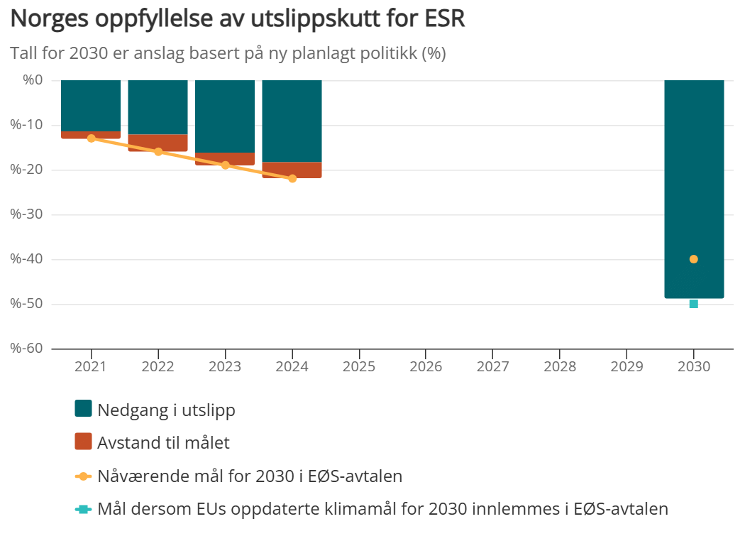 ESA ber Norge skjerpe klimainnsatsen. Det skriver Energi og Klima. ESA følger med på norsk oppfyllelse av klimaavtalen med EU. Den er ennå ikke oppdatert med skjerpede mål, og krever dermed kutt på 40 prosent i ikke-kvotepliktig sektor i 2030. Her ligger Norge litt bak skjema. I tillegg kommer arealsektoren, hvor det er i ferd med å bli et stort avvik som skyldes redusert opptak i skog (blant annet på grunn av tørke, barkebiller o.l.) og avskoging. Dersom det ikke lykkes å snu trenden, vil det være mulig å bruke fleksibilitetsmekanismer for å kompensere15.