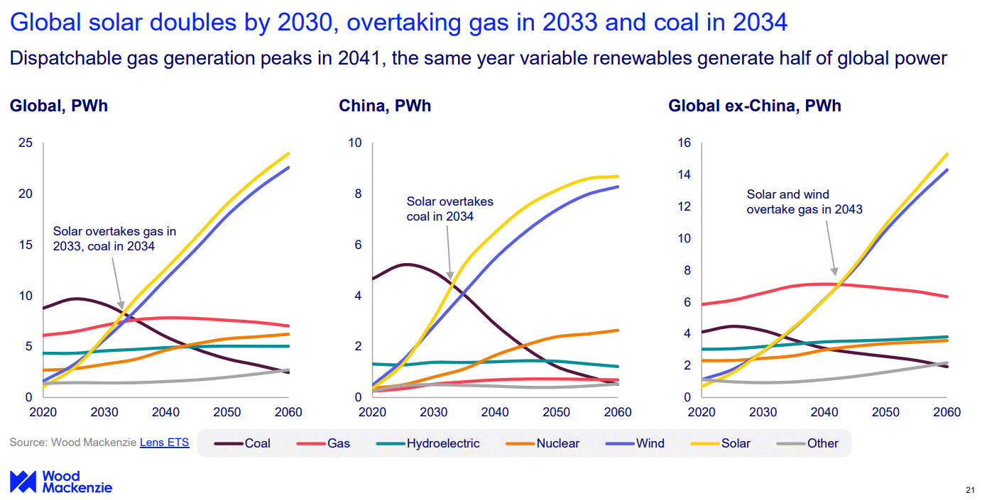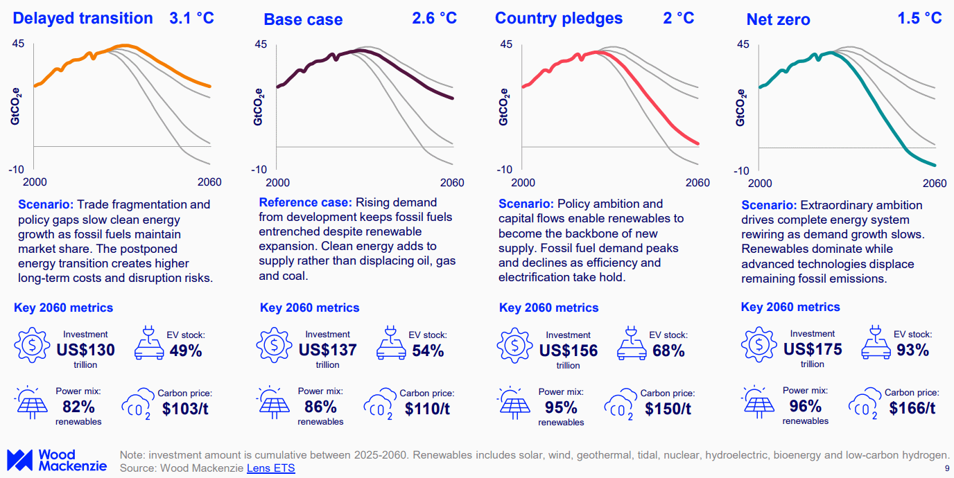 Konsulentselskapet Wood Mackenzie har publisert rapporten Energy Transition Outlook 2025-26. Utslippstoppen er noe høyere og forskjøvet fra 2027 til 2028 sammenlignet med fjorårets rapport. Dermed stiger også anslaget for den globale temperaturstigningen. Oppfølging av landenes klimamål vil kunne begrense oppvarmingen til 2 grader. Som alle andre forventer analytikerne at sol- og vindkraft blir den dominerende globale energikilden i fremtiden10.