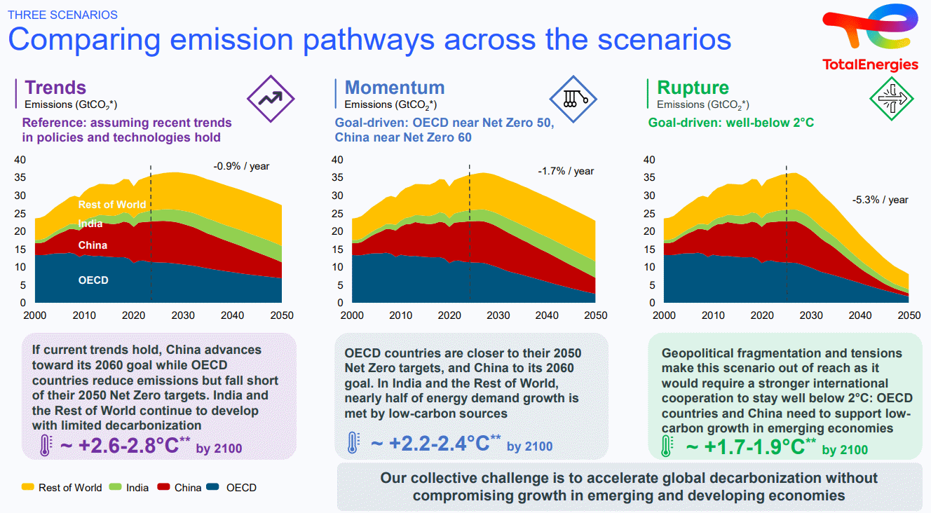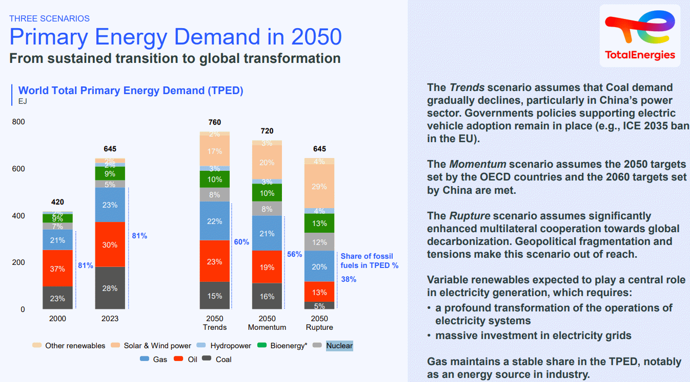 Det franske energiselskapet TotalEnergies har publisert rapporten TotalEnergies Energy Outlook 2025. Oljeselskapet spår en noe høyere temperaturøkning enn konsulentene i WoodMac. 2,7 grader i sitt hovedscenario og 2,3 grader hvis verdens land følger sine mål. TotalEnergies oppgir energi i 2050 målt som "primærenergi". Dette begrepet er kjent for å overdrive betydningen av særlig fossil energi og delvis også kjernekraft. Det er på grunn av store effektivitetstap i disse verdikjedene på veien fra utvinning til nyttig energi i stikkontakten11.