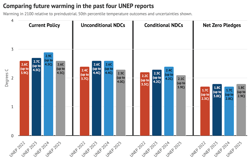FNs miljøprogram UNEP har publisert rapporten Emissions Gap Report 2025: Off Target. Med dagens politikk bærer det mot 2,8 grader global oppvarming. Anslaget i fjor var 3,1 grader. Landenes innmeldte klimamål (NDC) vil bringe oss til 2,4 grader, ned fra 2,7 i fjor. UNDP ser altså en bevegelse i riktig retning. Oppdaterte beregningsmetoder gir 0,1 grad forbedring, men utlignes av USAs uttrekk fra Paris-avtalen som gir 0,1 grad forverring. Nye innmeldte mål flytter såvidt nålen sett opp mot 1,5-gradersmålet8. Klimaforsker Zeke Hausfather har sammenlignet med årets rapport med de tre siste fra UNEP, hvor endringene kan ses tydlig (nederste figur)9.