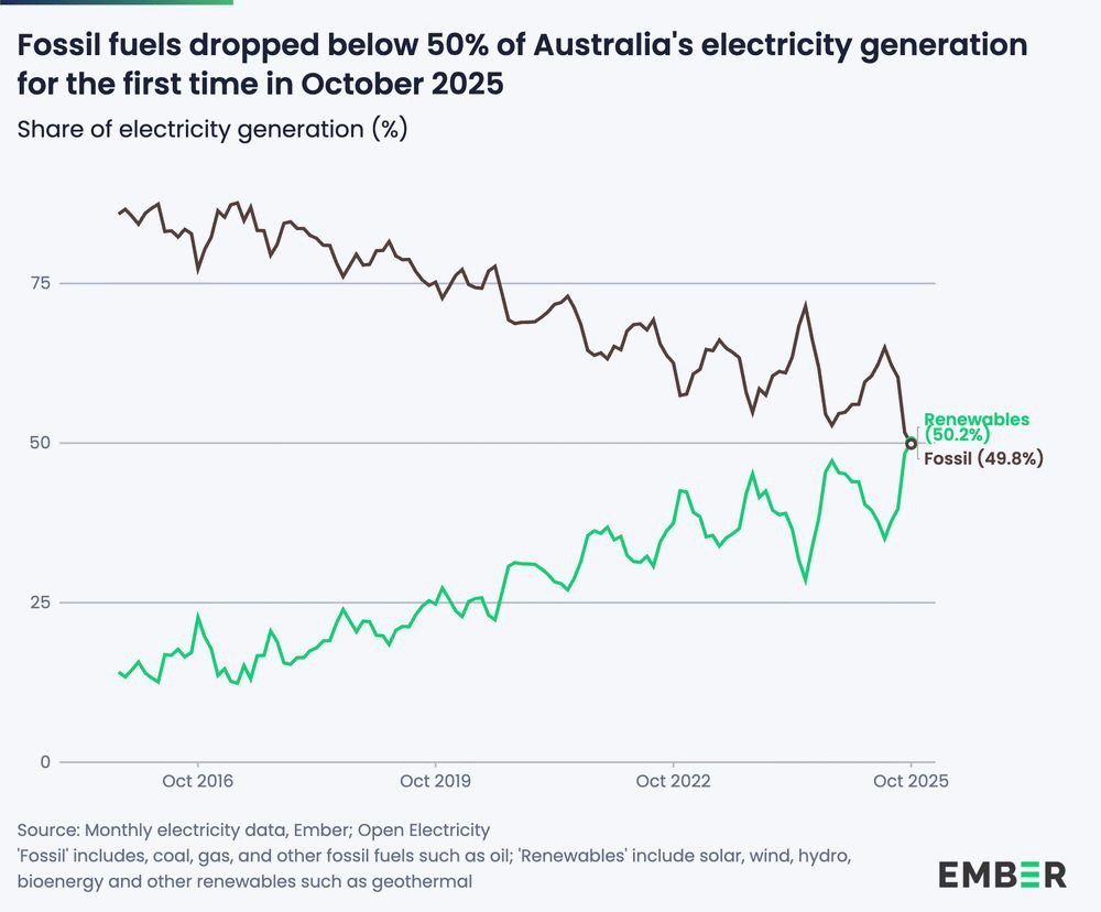 Analytiker Nicolas Fulghum skriver på Bluesky at fornybar elektrisitet for første gang er større enn fossil elektrisitet i Australia. For ti år siden, i oktober 2025, var kraftmiksen 86 prosent fossil. Data er fra Ember6.