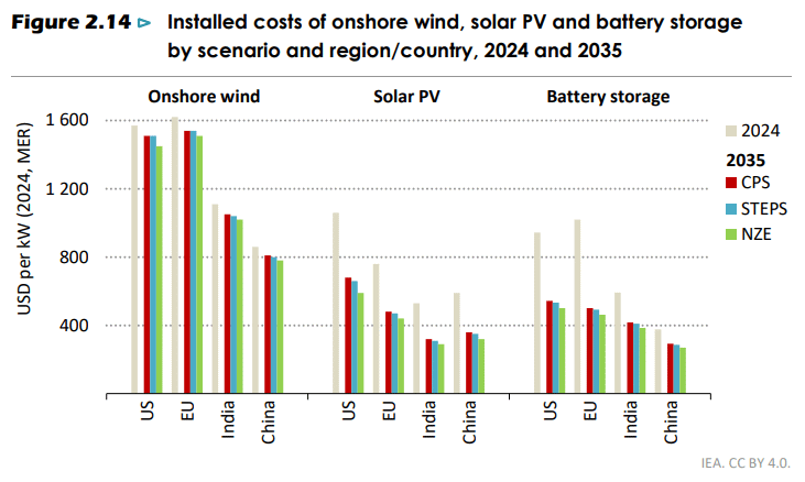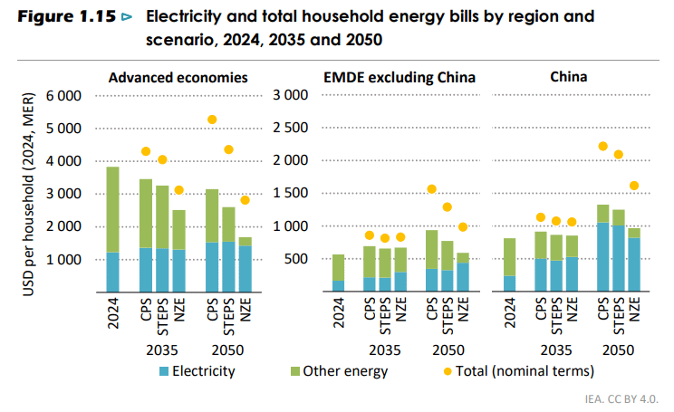 Alle scenarioer viser at utslippene før eller senere går ned. Men senere betyr høyere global oppvarming med tilhørende kraftig økte kostnader og skader. I alle scenarioer tar sol- og vindkraft over som verdens viktigste energikilder. Kostnadene, særlig for solkraft og batterier, ventes å falle ytterligere og mest i avanserte økonomier. IEA, i likhet med en rekke andre analysemiljøer, knuser myten om at renere energi gir dyrere energi. Jo mer ambisiøs klimapolitikken og energiomstillingen er, jo lavere blir husholdningenes totale energiregninger. I tillegg kommer den langt større gevinsten av at kostnader og skader forbundet med økt global temperatur i større grad unngås.