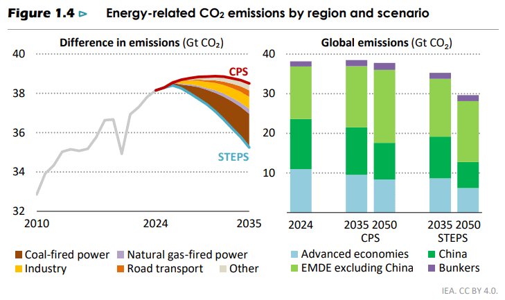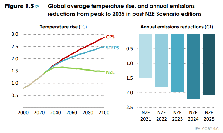 Det internasjonale energibyrået (IEA) har publisert World Energy Outlook 2025, også kjent som "energibibelen"1. I scenario STEPS (Stated Policies) øker global temperatur med 2,5 grader. I et gammelt, nå gjenoppstått, scenario CPS (Current Policies), øker den med 3 grader. IEAs tidligere scenario, APS (Announced Pledges), er tatt ut, noe som forklares med forsinket annonsering av oppdaterte klimamål. Et normativt scenario NZE (Net Zero Emissions) er også med. Reintroduksjonen av CPS hevdes av enkelte å være presset frem av Trump-administrasjonen, og har fått blandede reaksjoner. Enkelte mener det er nyttig å se størrelsen på kostnadene og skadene som vil ramme vanlige innbyggere hvis klimapolitikken ikke skjerpes. Andre mener CPS bygger på helt urealistiske forutsetninger, blant annet ingen økt elbilandel utenfor Europa og Kina frem til 2050 og at veksten i årlig installert solkraft plutselig stopper2.