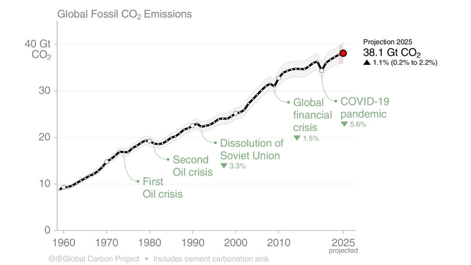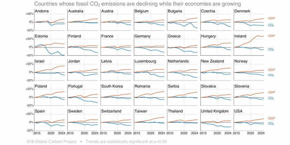 Ledende klimaforskere har publisert Global Carbon Budget 20253. Studien gir prognoser på utslipp og opptak for 2025. Glen Peters oppsummerer studien på Bluesky4. Veksten i fossile utslipp fra Kina og India vokser mindre enn før, mens værforhold gir midlertidige økte utslipp fra USA og EU i 2025. Samlet gir det en vekst i fossile utslipp på 1,1 prosent. Opptak av CO2 ventes å øke igjen knyttet til globale værmønstre. Tar man med reduserte utslipp fra arealbruksendringer gir det en samlet endring i menneskeskapte utslipp på minus 0,04 prosent sammenlignet med 2024, i praksis flatt. Siden 2015 har 35 land kombinert økonomisk vekst med fallende utslipp.