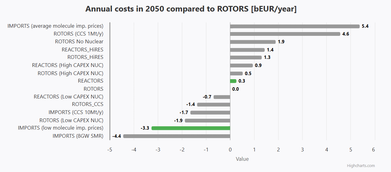 VITO har foretatt sensitivitetsanalyser av scenarioene i PATHS2050 som analyserer alternativer for videreutvikling av energisystemet i Belgia mot 2050. Analysene viser at de opprinnelige konklusjonene står seg. Tre scenarioer ble vurdert: ROTORS (vindkraft), REACTORS (kjernekraft) og IMPORTS. Mer av alt bygges i alle scenarioer. Belgia produserer i dag 14 TWh kjernekraft, som øker til 28 i ROTORS og 56 TWh i REACTORS. Vind leverer i dag 8 TWh fra vindkraft på land og 8 TWh fra havvind. I ROTORS øker det til henholdsvis 34 og 94 TWh, og i REACTORS til 22 og 53 TWh. Solkraft øker fra dagens 14 TWh til 35 i ROTORS og 39 TWh i REACTORS. De samlede systemkostnadene for ROTORS og REACTORS er om lag like. CO2-utslippene er klart lavest for ROTORS i overgangsfasen, men en liten residual gjenstår i 2050 som kompenseres i industrien. De øvrige scenarionene kommer i null i 2050. Frem til 2030 anbefaler utrederne økt tempo på elektrifisering av bygninger og transport, rask utbygging av sol- og vindkraft, nye gasskraftverk og en klar politikk for karbonfangst- og lagring samt hydrogen. Hvis kjernekraft velges og denne skal kunne være i drift fra 2040-45, må det snarest utarbeides en strategisk plan. Kjernekraft blir valgt i scenarioene opp til en investeringskostnad på 177 668 kr.Valutakurs per 1. juli 2025. per kW forutsatt en subsidiert lånerente på tre prosent og ingen forsinkelser41.