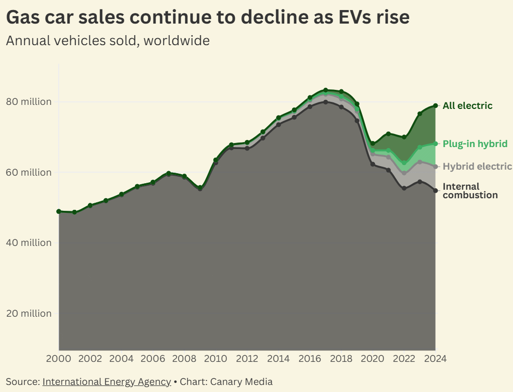 Canary Media skriver at det globale salget av fossilbiler har stupt 31 prosent siden toppen. Året det ble solgt flest fossilbiler var 2017, med nær 80 millioner biler. I 2024 var dette redusert til like under 55 millioner, det laveste på 20 år. I 2024 ble det solgt nesten 11 millioner ren elbiler, klart flest i Kina31.