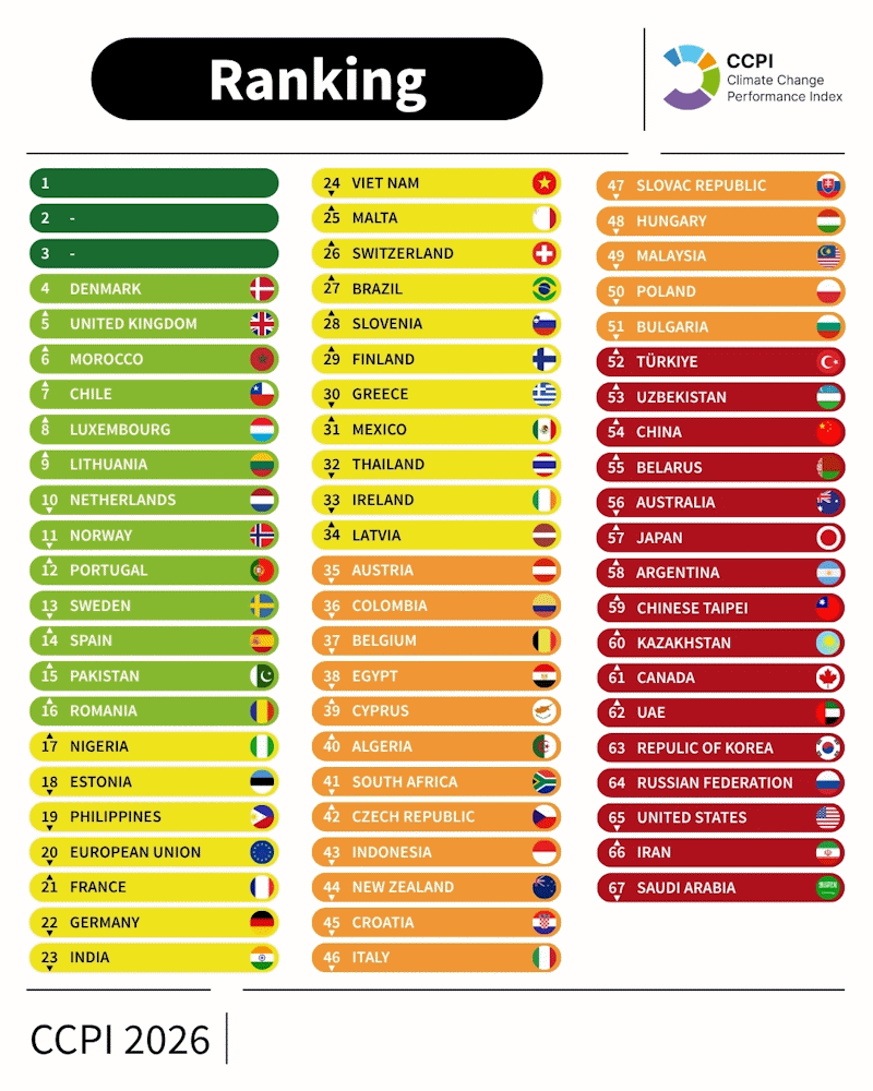 NewClimate Institute har publisert rapporten Climate Change Performance Index 2026. Rapporten rangerer landenes klimainnsats årlig og tradisjonen tro står de tre pallplassene tomme. Beste land, på fjerdeplass, er som ifjor Danmark. Storbritannia klatrere til femteplass. Norge faller to plasser til ellevte plass8.