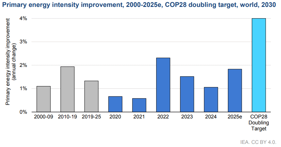 Det internasjonale energibyrået (IEA) har publisert rapporten Energy Efficiency 2025. En fallende trend de siste årene er nå i ferd med å snus. Takten i energieffektivisering øker igjen, og ligger an til å nesten dobles i 2025 sammenlignet med 2024. For å nå målet satt på COP28 må takten dobles en gang til12.